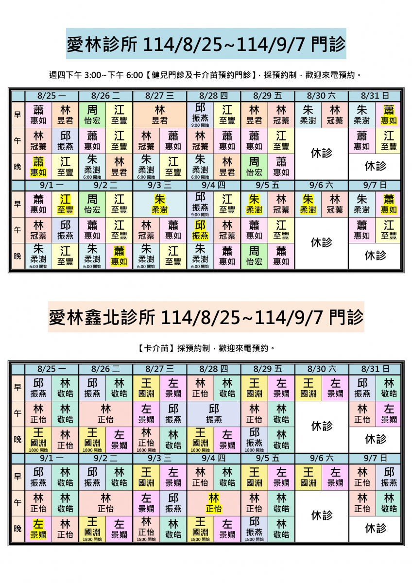 各位親愛的朋友您好:114/8/25-114/9/7兩院區醫師門診公告。
