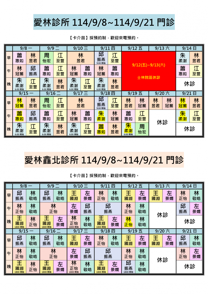 各位親愛的朋友您好:114/9/8-114/9/21兩院區醫師門診公告。
