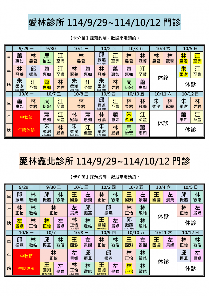 各位親愛的朋友您好:114/9/29-114/10/12兩院區醫師門診公告。