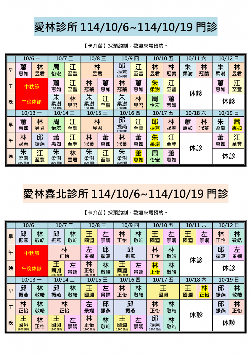 各位親愛的朋友您好:114/10/6-114/10/19兩院區醫師門診公告。