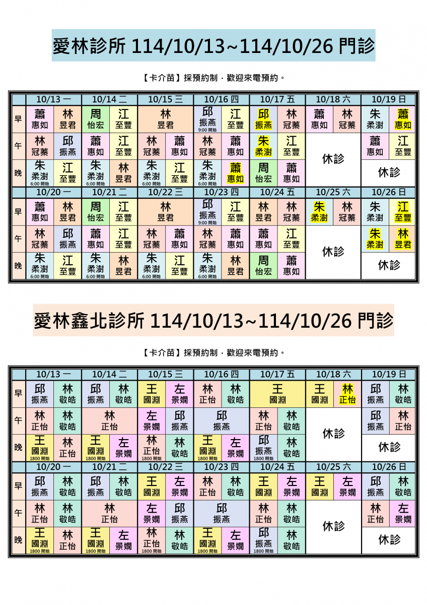 各位親愛的朋友您好:114/10/13-114/10/26兩院區醫師門診公告。