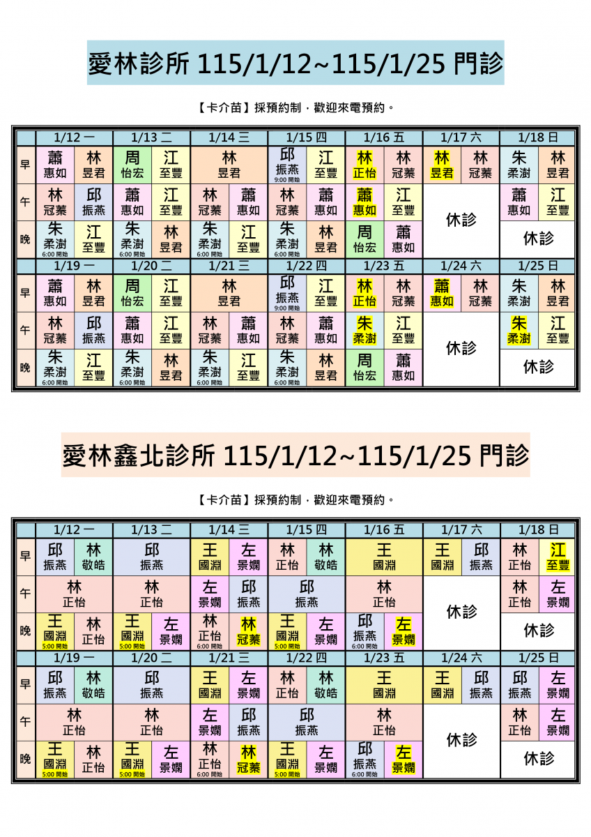 各位親愛的朋友您好:115/1/12-115/1/25兩院區醫師門診公告!