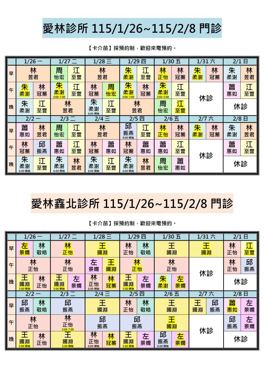 各位親愛的朋友您好:115/1/26-115/2/8兩院區醫師門診公告!