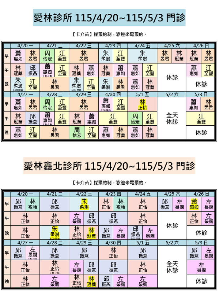 各位親愛的朋友您好:115/4/20-115/5/3兩院區醫師門診公告!