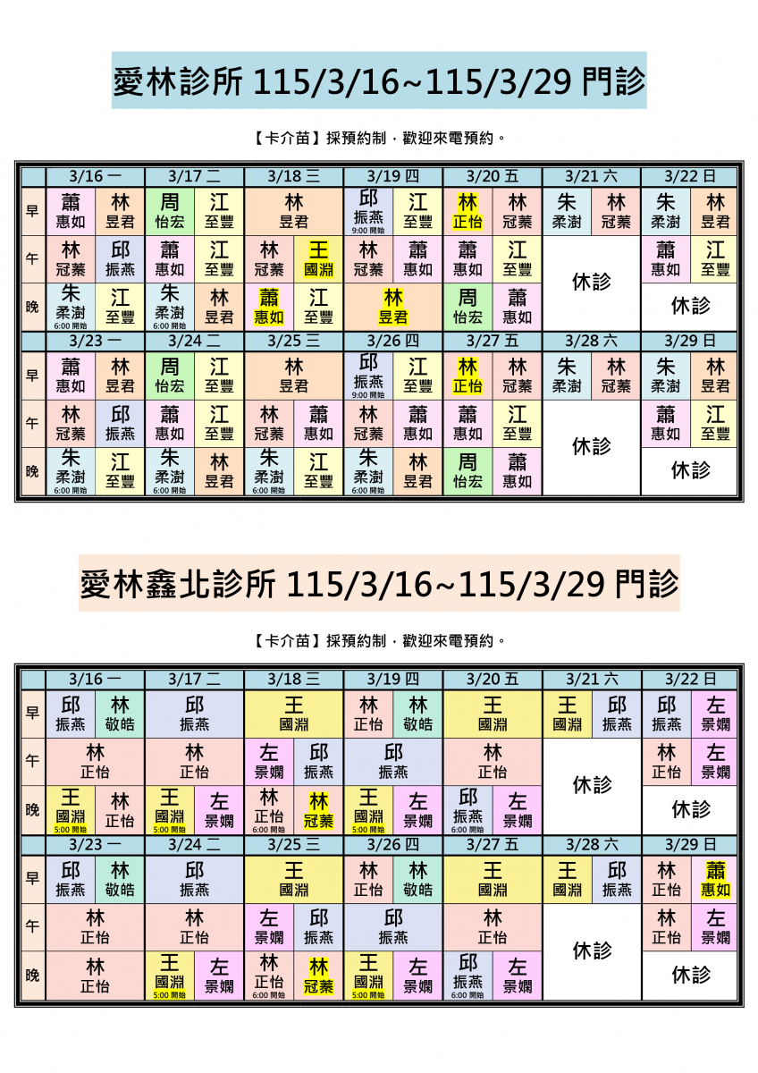 各位親愛的朋友您好:115/3/16-115/3/29兩院區醫師門診公告!