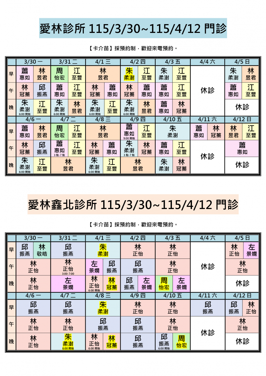 4/4(六)兩院區全天休診,4/5(日)起恢復照常看診。