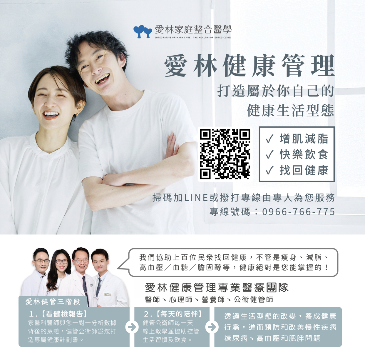 減重、飲食控制、慢性病管理,真的不用靠自己硬撐! 愛林診所的健康管理,不只是「告訴你要做什麼」,而是陪你一起找出適合你生活節奏的方法: