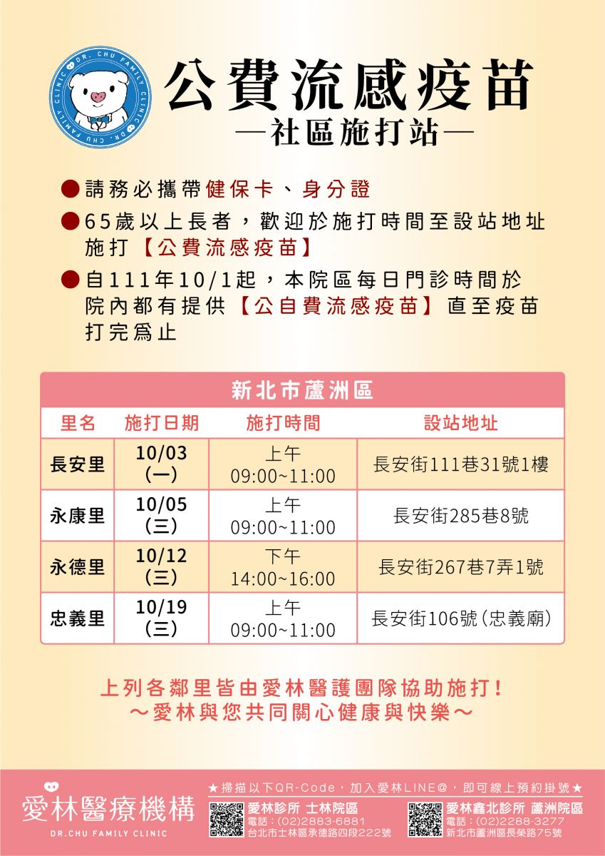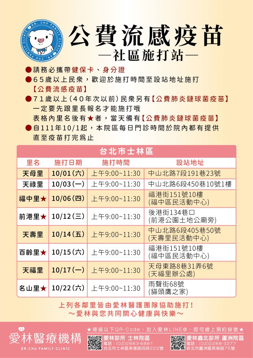 111年10月起,愛林醫護團隊協助公費流感疫苗社區施打站,士林及蘆洲都有喔!