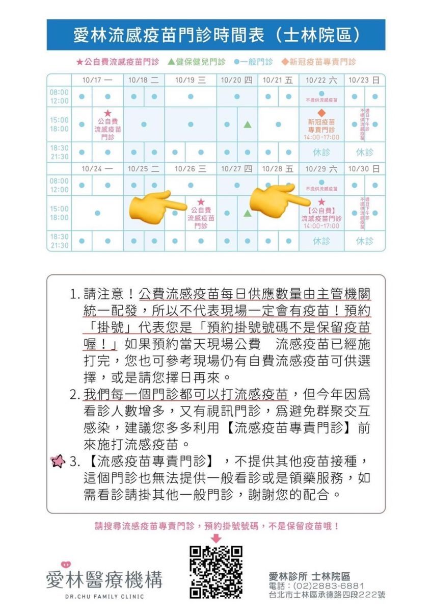 【士林院區】10/26(三)、10/29(六)加開「流感疫苗專責門診」!請多加利用!