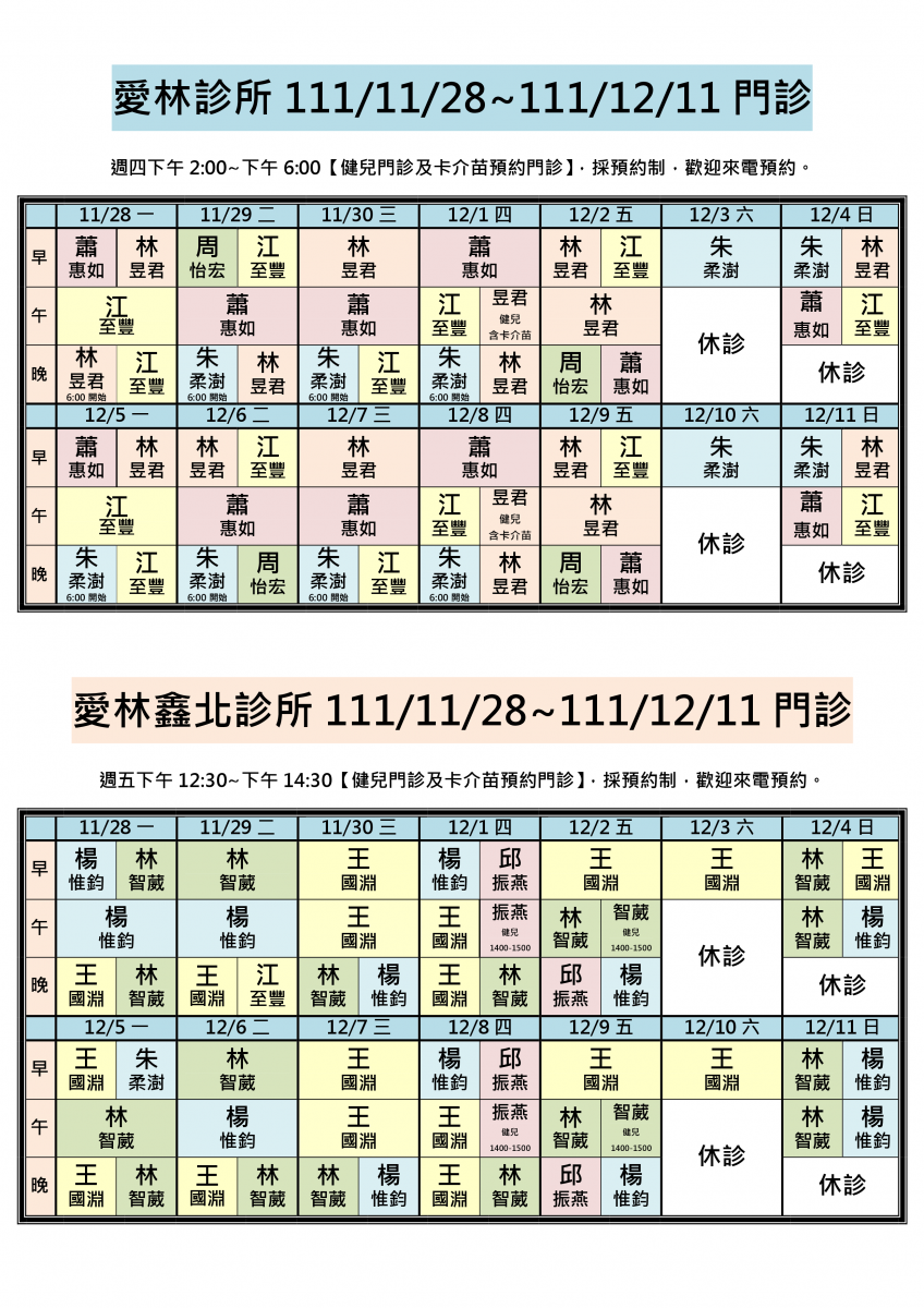 111/11/28~111/12/11兩院區醫師門診異動,