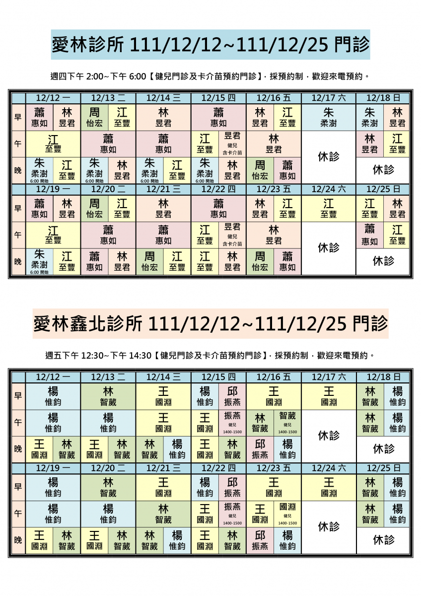 111/12/12~111/12/25兩院區醫師門診異動,