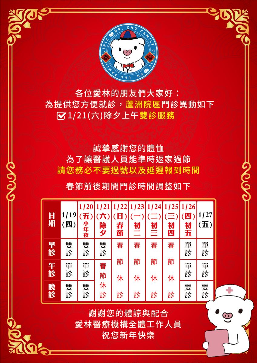 ★ 除夕下午至1/25(三)初四春節休診