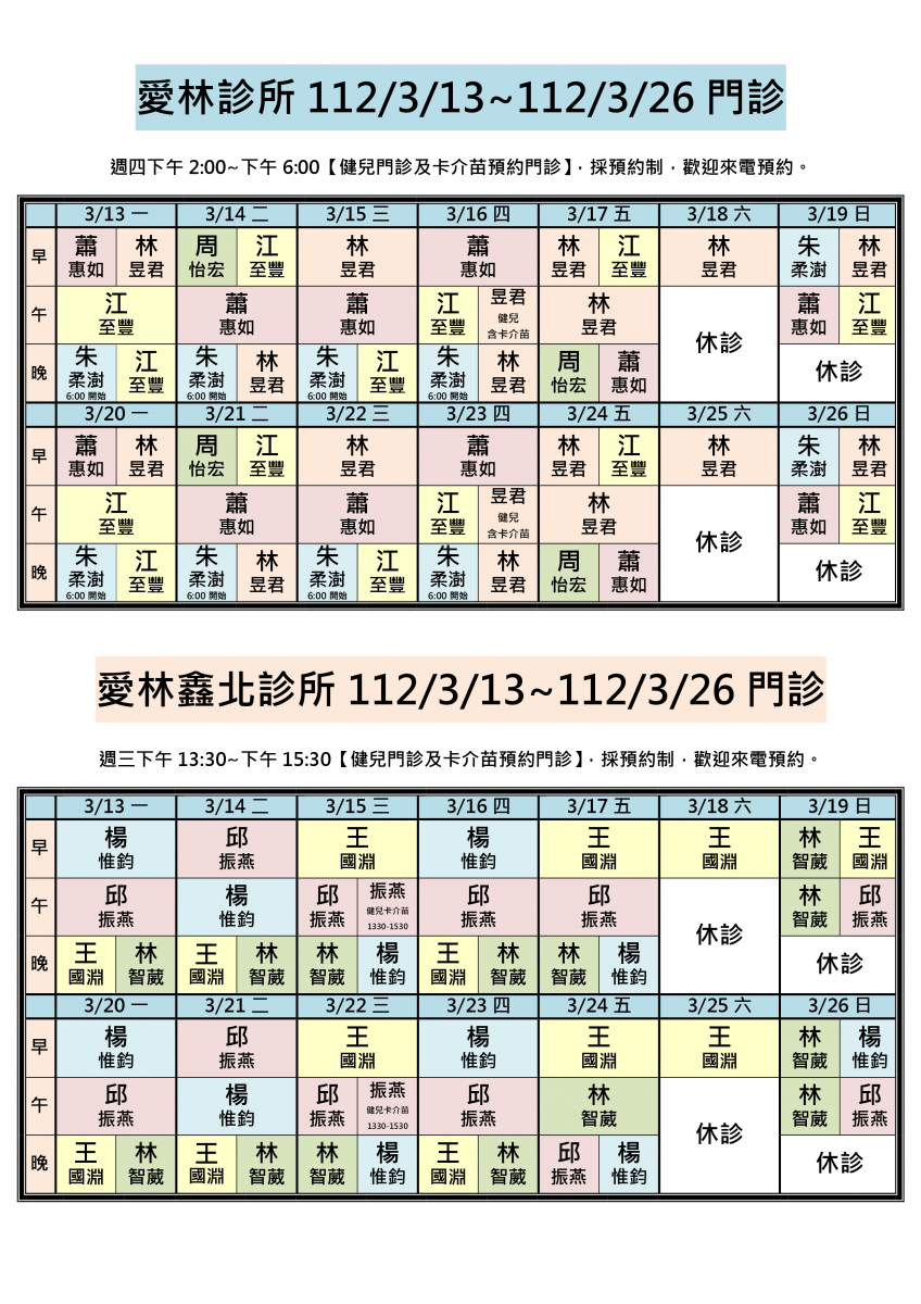 112/3/13~112/3/26兩院區醫師門診異動,