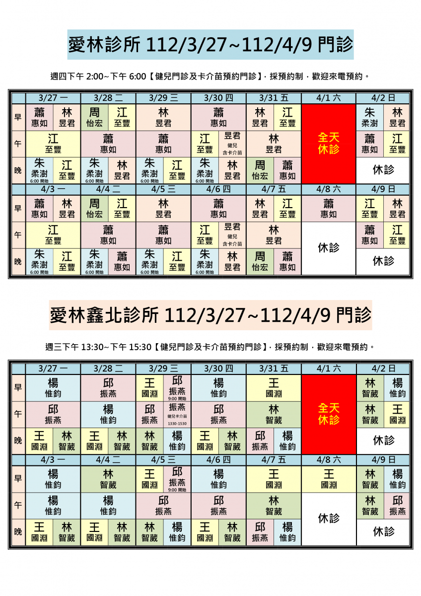 112/3/27~112/4/9兩院區醫師門診異動,