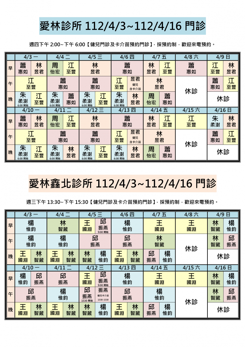 112/4/3~112/4/16兩院區醫師門診異動,