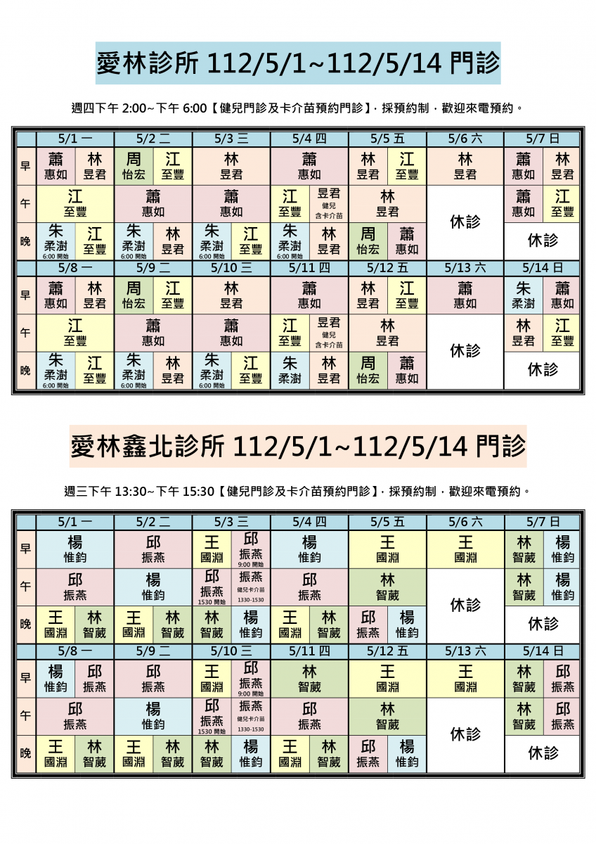 各位親愛的朋友您好:112/5/1-112/5/14兩院區醫師門診異動,即日起《兩院區週六下午、晚上及週日晚上休診》。蘆洲院區於長榮路75號為您服務!