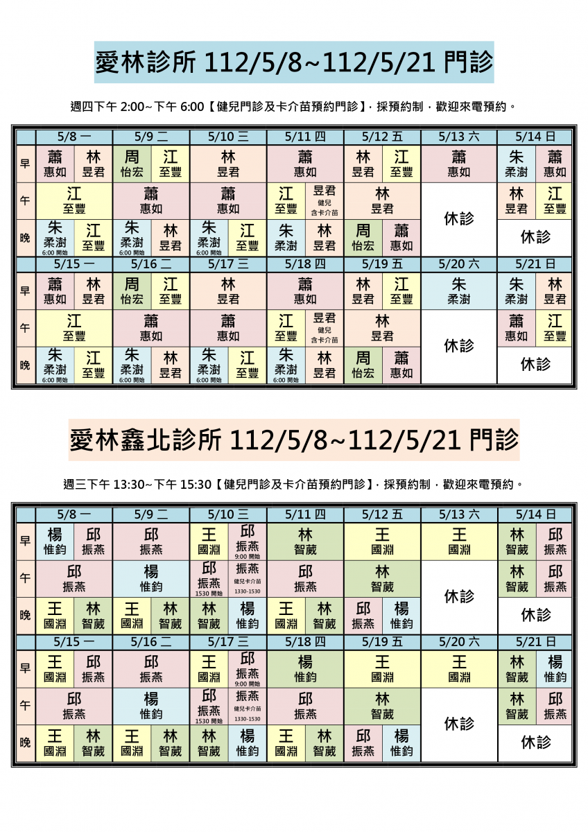 112/5/8~112/5/21兩院區醫師門診異動,