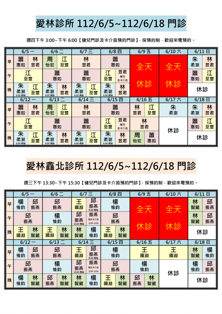 112/6/5~112/6/18兩院區醫師門診異動,