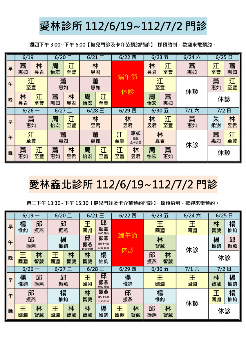 112/6/19~112/7/2兩院區醫師門診異動,