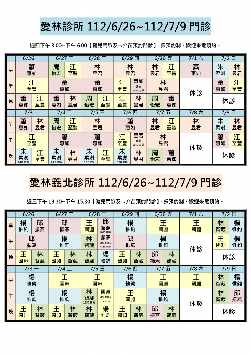 112/6/26~112/7/9兩院區醫師門診異動,