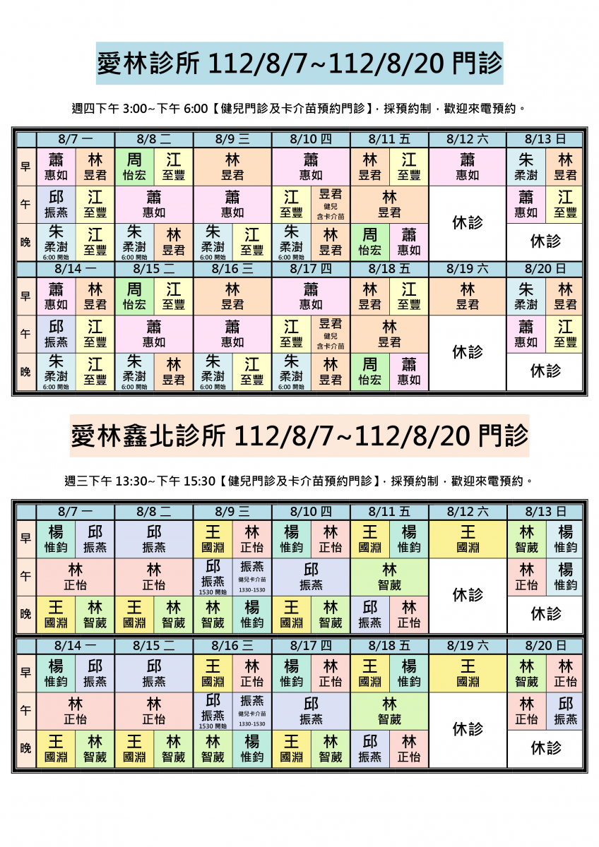 112/8/7~112/8/20兩院區醫師門診異動,