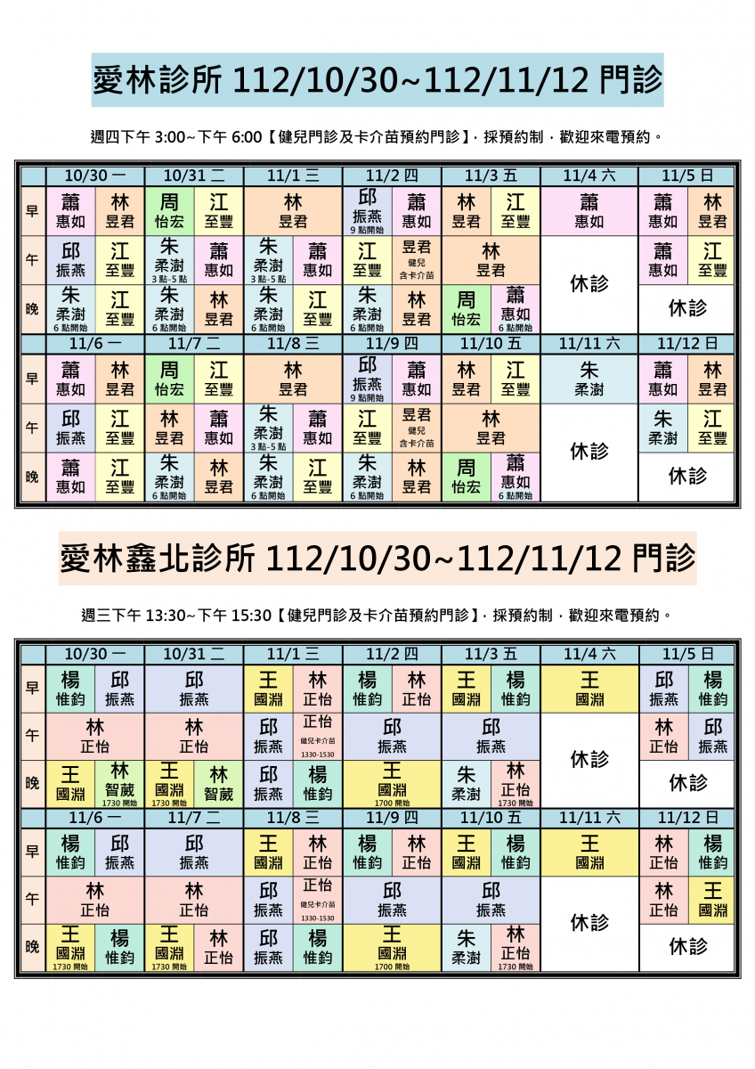 112/10/30~112/11/12兩院區醫師門診異動,