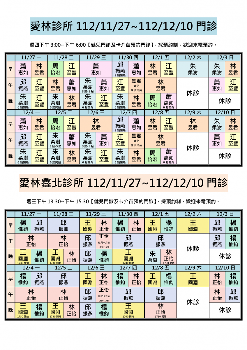 各位親愛的朋友您好:112/11/27-112/12/10兩院區醫師門診異動,即日起《兩院區週六下午、晚上及週日晚上休診》。