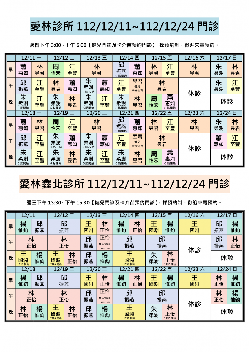 各位親愛的朋友您好:112/12/11-112/12/24兩院區醫師門診異動,即日起《兩院區週六下午、晚上及週日晚上休診》。