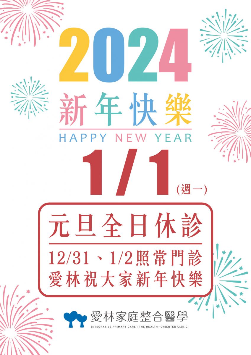113/1/1(一)元旦休診,1/2(二)起恢復看診,愛林祝您新年快樂!