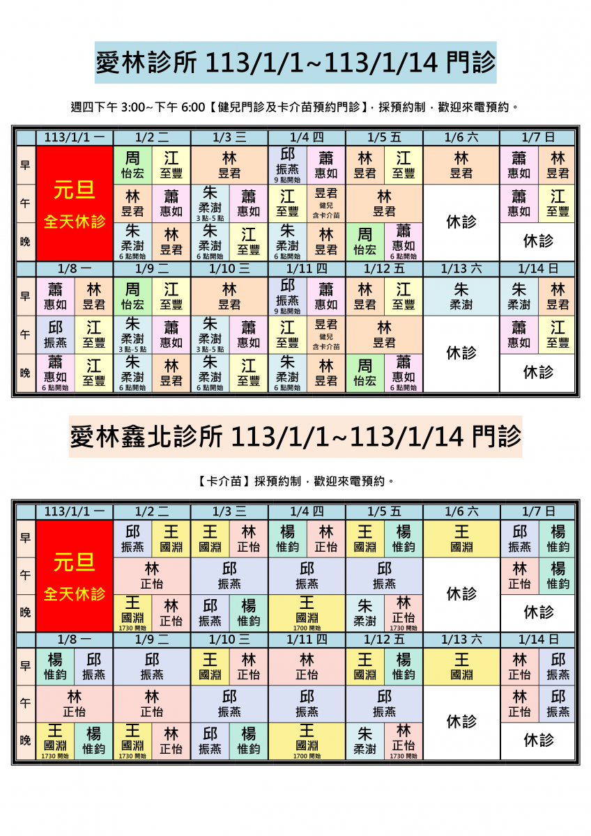 各位親愛的朋友您好:113/1/1-113/1/14兩院區醫師門診公告,即日起《兩院區週六下午、晚上及週日晚上休診》。