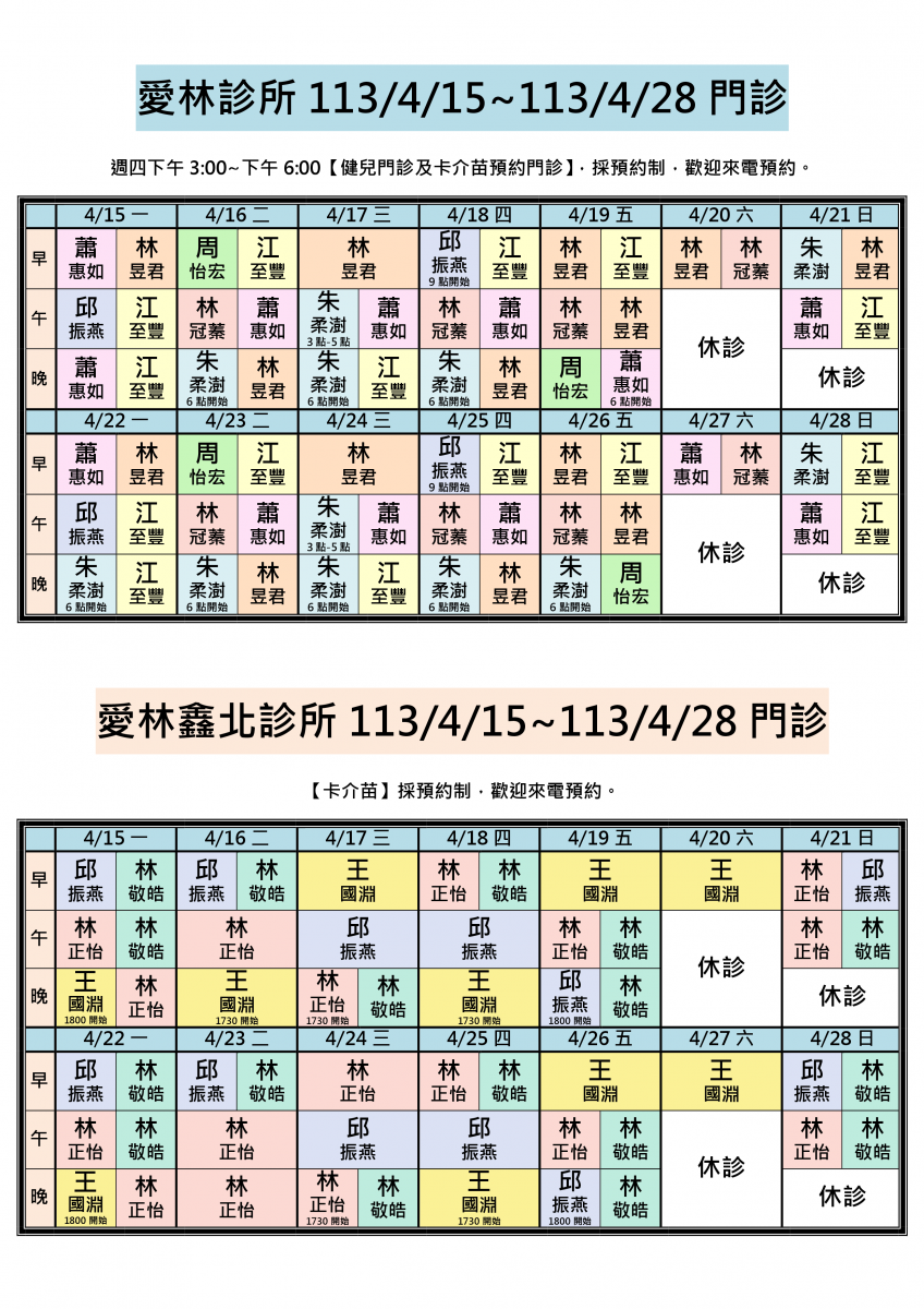 113/4/8~113/4/21兩院區醫師門診異動,