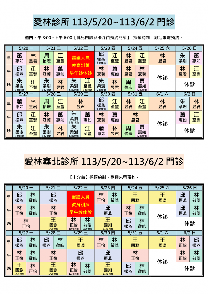 各位親愛的朋友您好:113/5/20-113/6/2兩院區醫師門診公告,即日起《兩院區週六下午、晚上及週日晚上休診》。