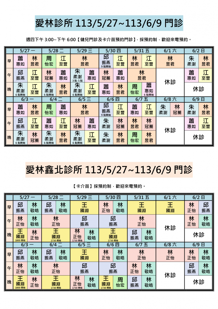 113/5/27~113/6/9兩院區醫師門診異動,