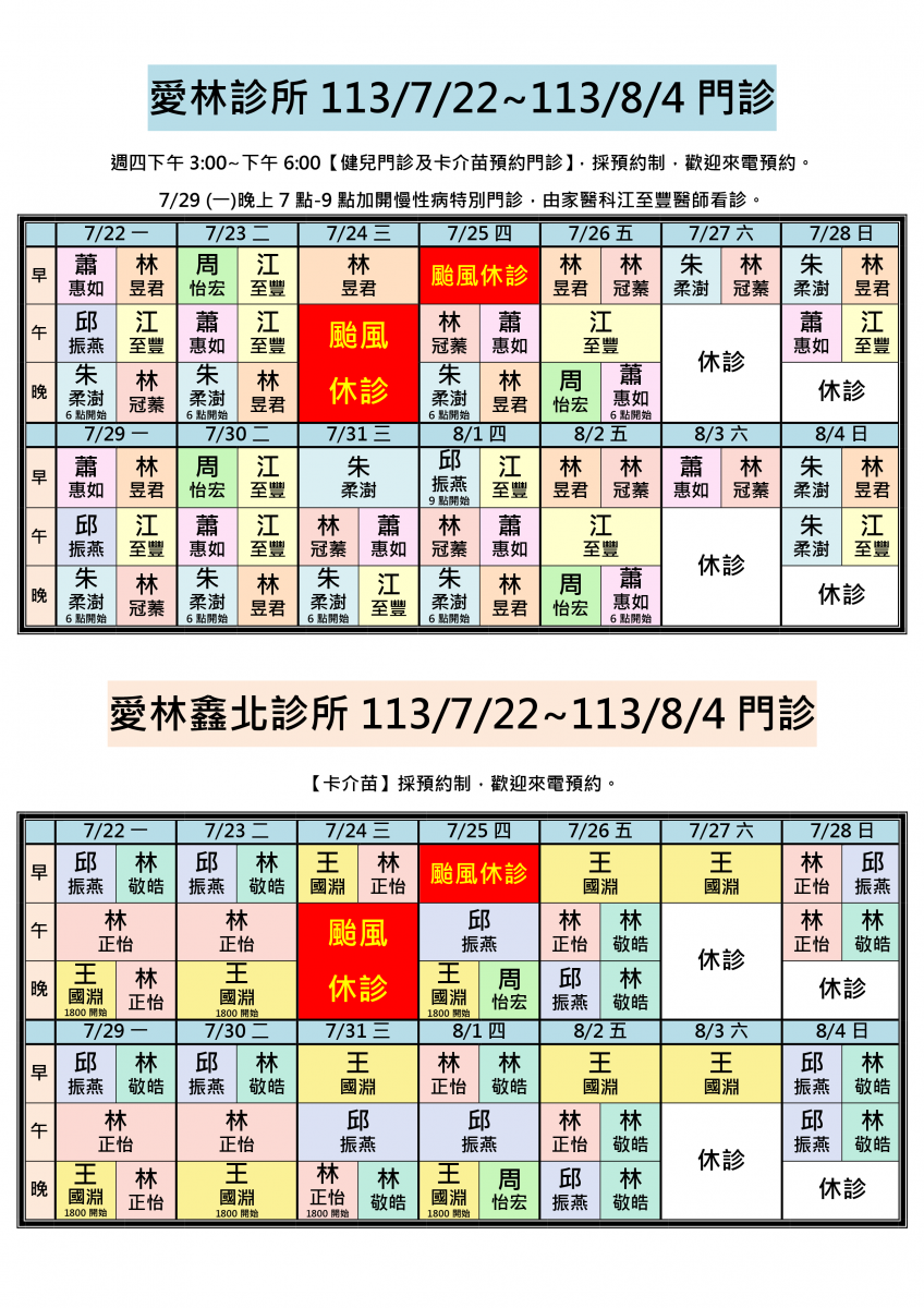 113/7/15~113/8/4兩院區醫師門診異動,