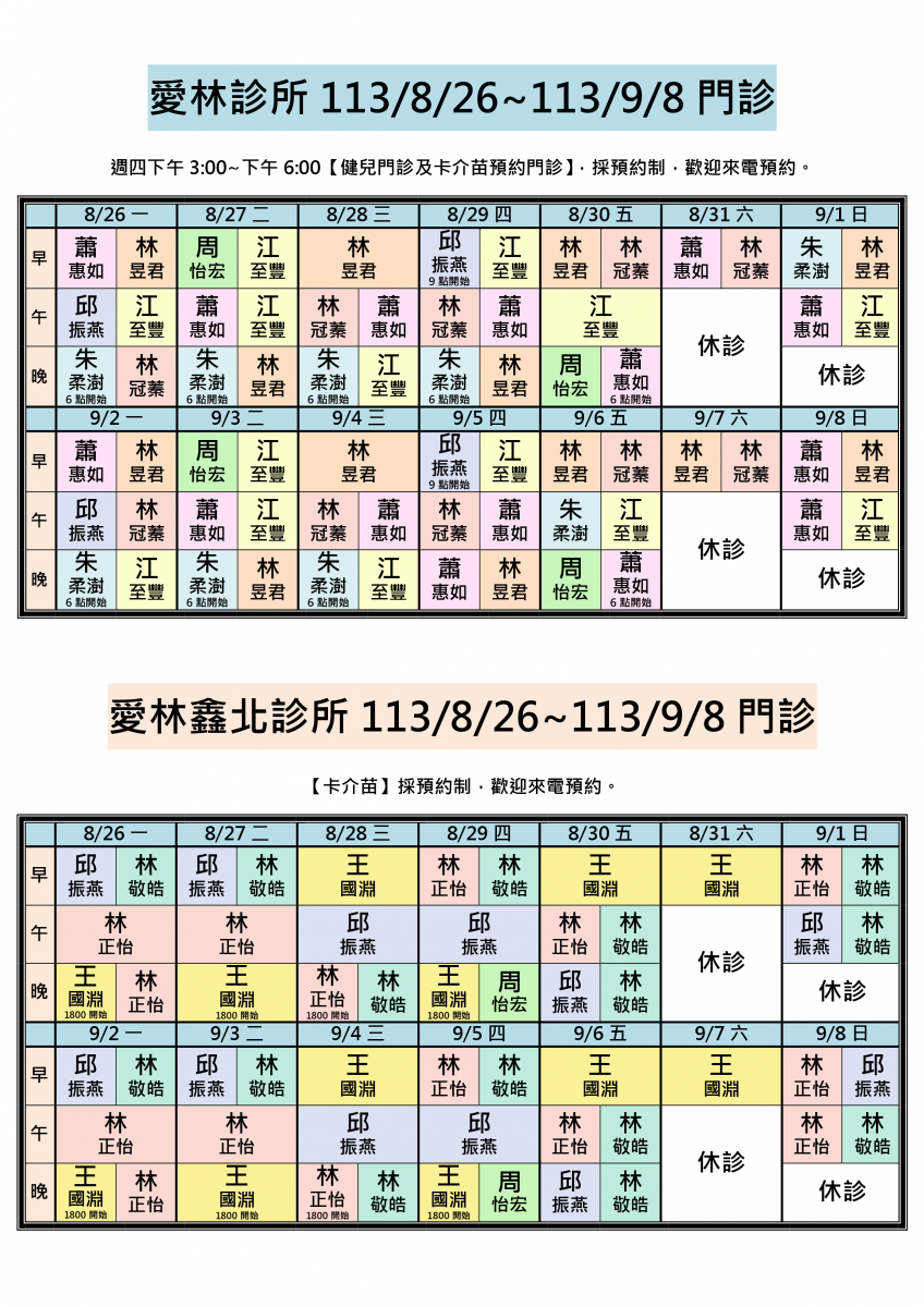 113/8/26~113/9/8兩院區醫師門診異動,