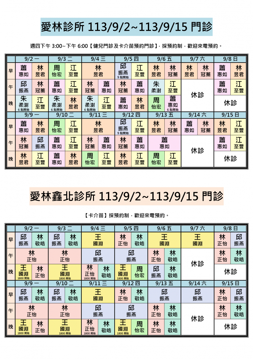 113/9/2~113/9/15兩院區醫師門診異動,