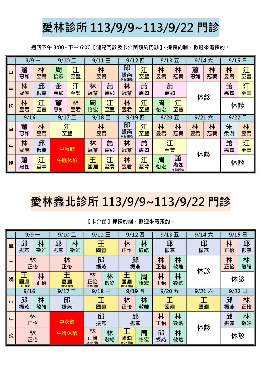 各位親愛的朋友您好:113/9/9-113/9/22兩院區醫師門診公告,即日起《兩院區週六下午、晚上及週日晚上休診》