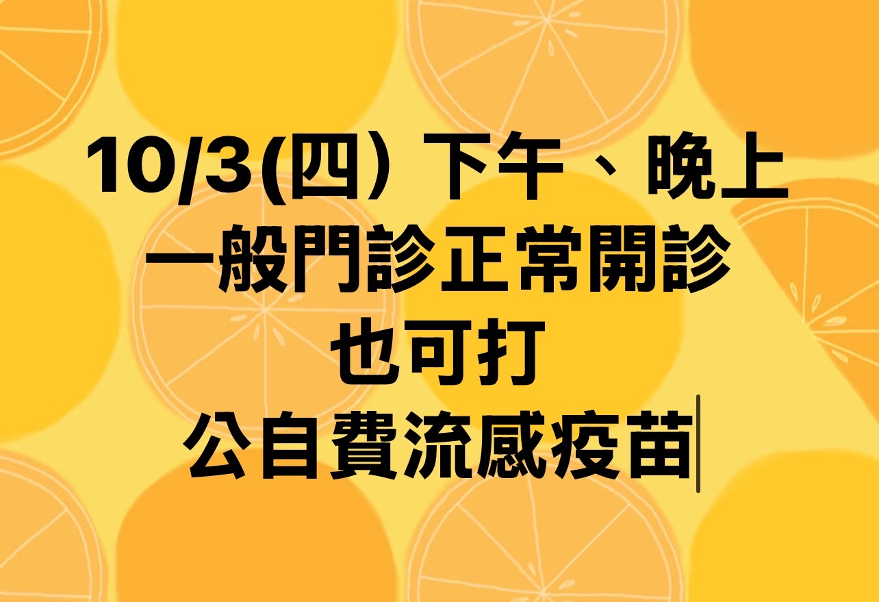 10/3(四)下午、晚上一般門診正常開診,也可打公自費流感疫苗!士林院區下午健兒門診暫停一次。