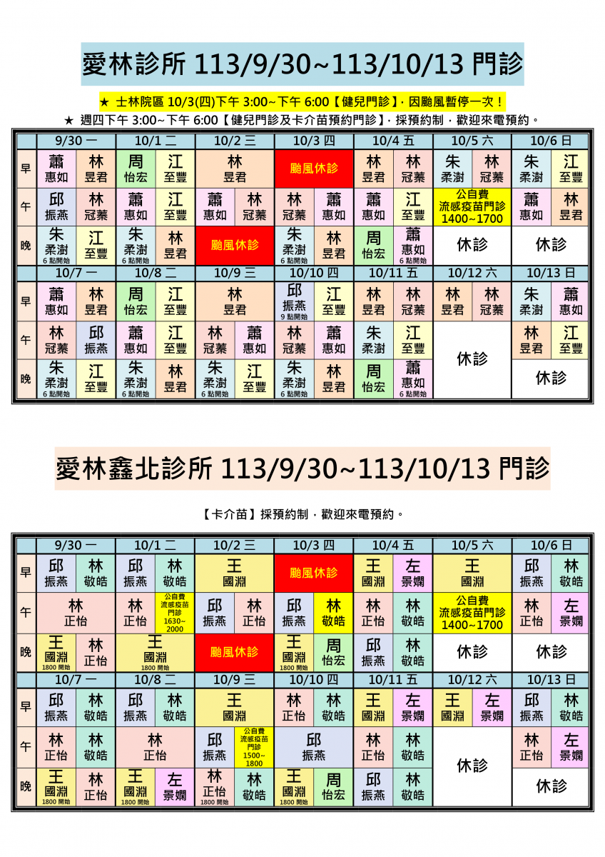 113/9/30~113/10/13兩院區醫師門診異動,