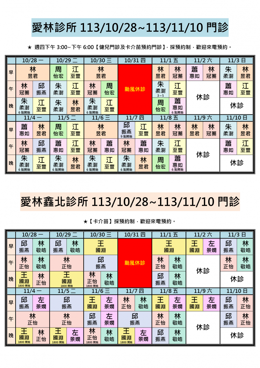 各位親愛的朋友您好:113/10/28-113/11/10兩院區醫師門診公告。
