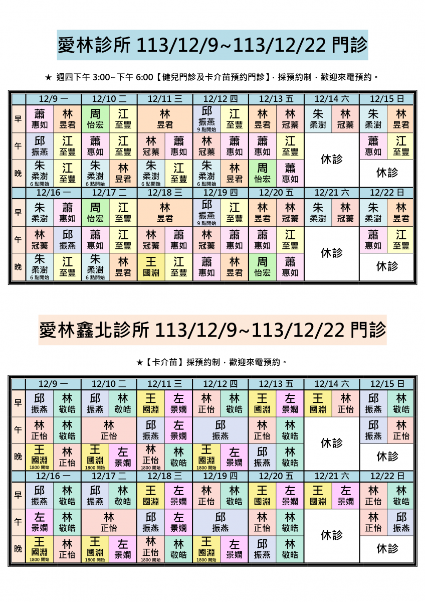 各位親愛的朋友您好:113/12/9-113/12/22兩院區醫師門診公告。