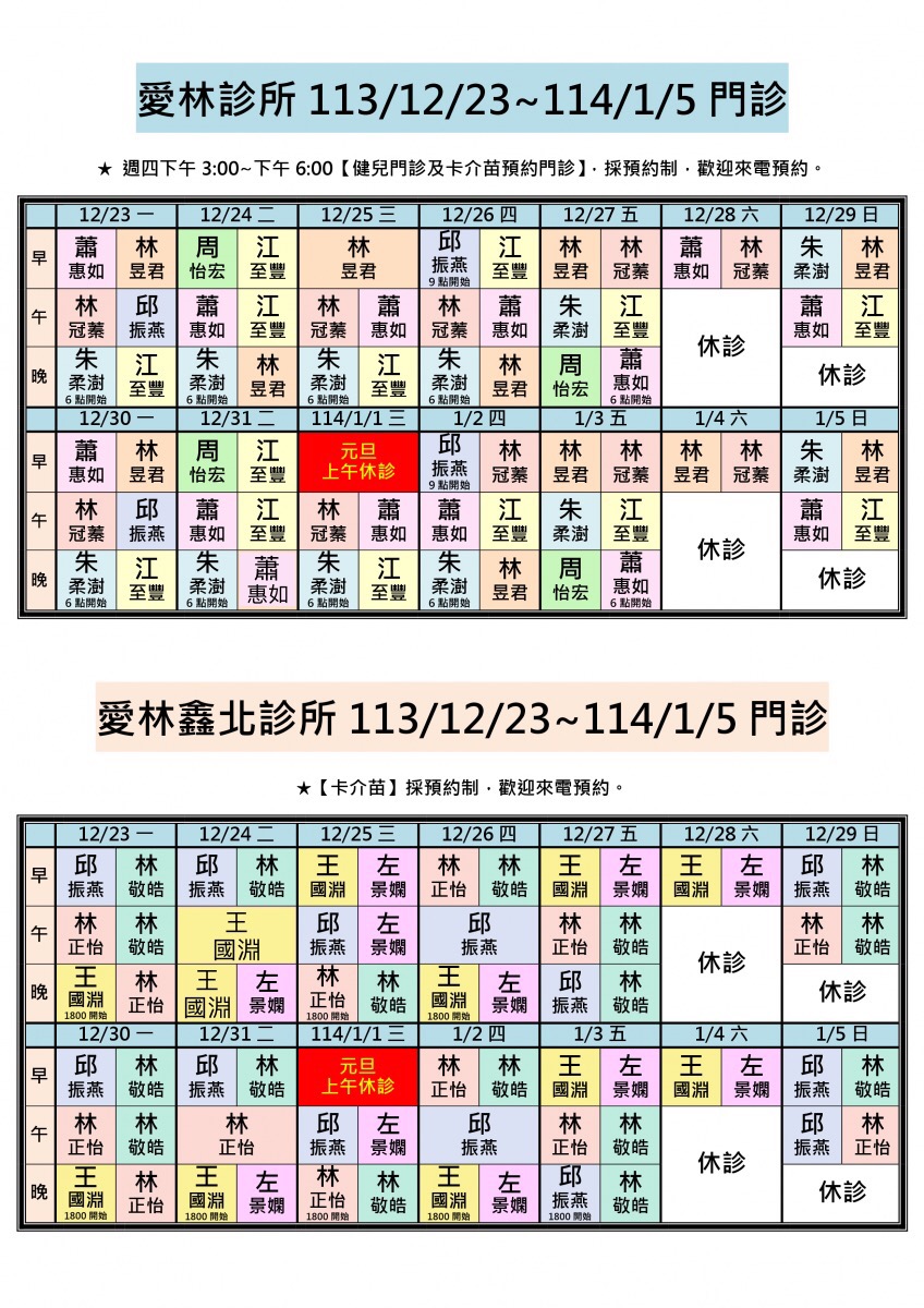 113/12/23~114/1/5兩院區醫師門診異動,