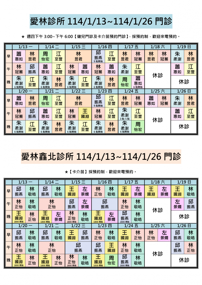 各位親愛的朋友您好:114/1/13-114/1/26兩院區醫師門診公告。