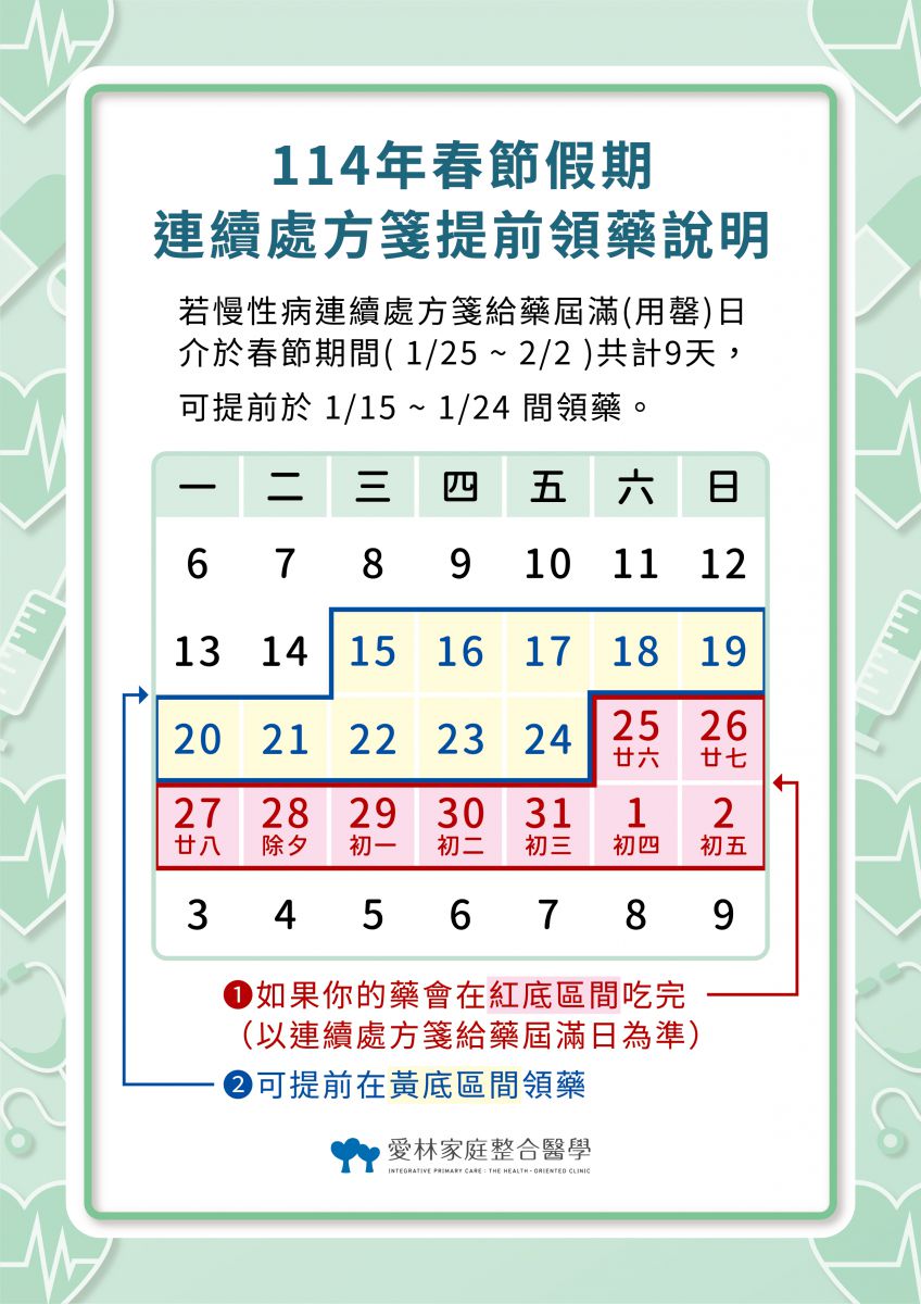 114年春節假期連續處方箋提前領藥說明:若慢性病連續處方箋給藥屆滿(用罄)日介於春節期間(1/25~2/2)共計9天,可提前於1/15~1/24間領藥。
