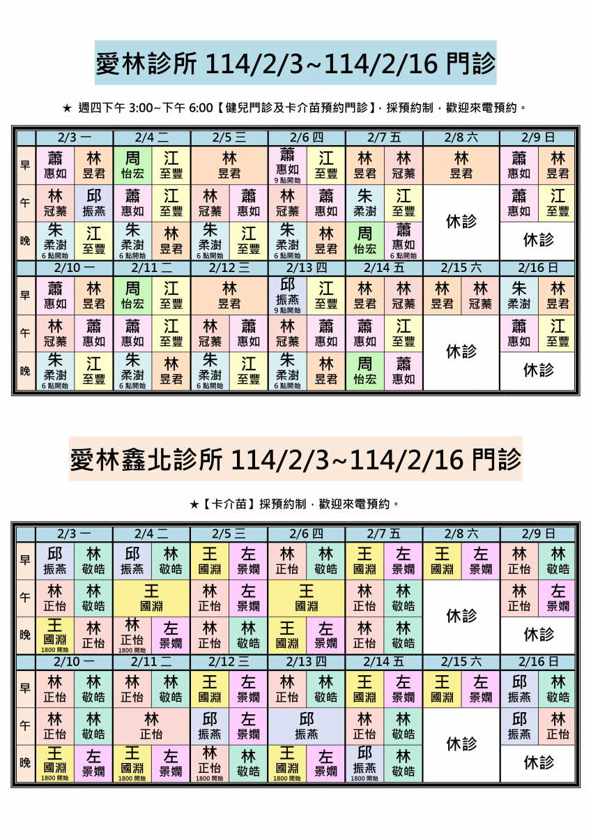 各位親愛的朋友您好:114/2/3-114/2/16兩院區醫師門診公告。