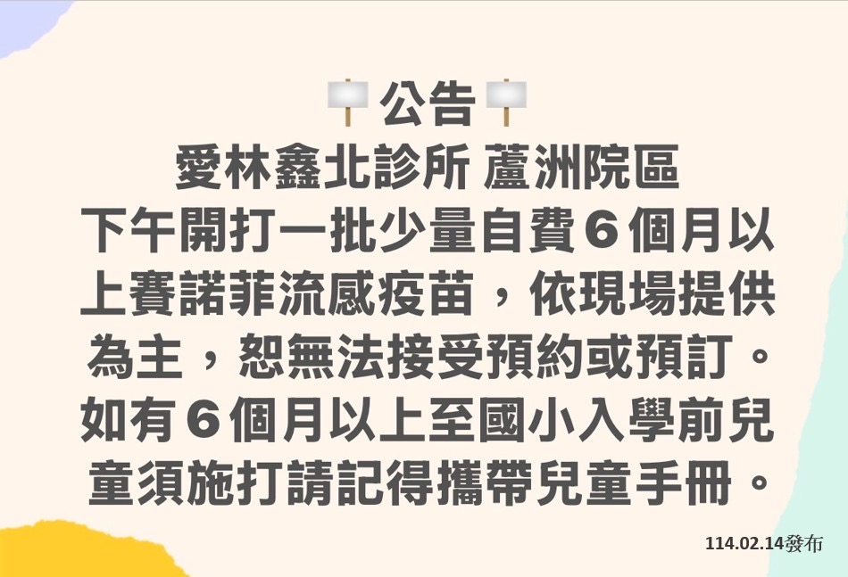愛林鑫北診所蘆洲院區今(2/14)下午開打一批少量自費6個月以上賽諾菲流感疫苗,依現場提供為主,恕無法接受預約或預訂。如有6個月以上至國小入學前兒童須施打請記得攜帶兒童手冊。