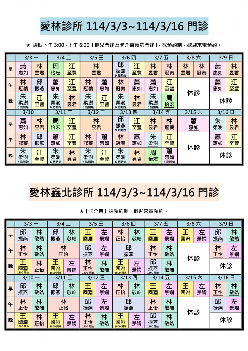 各位親愛的朋友您好:114/3/3-114/3/16兩院區醫師門診公告。
