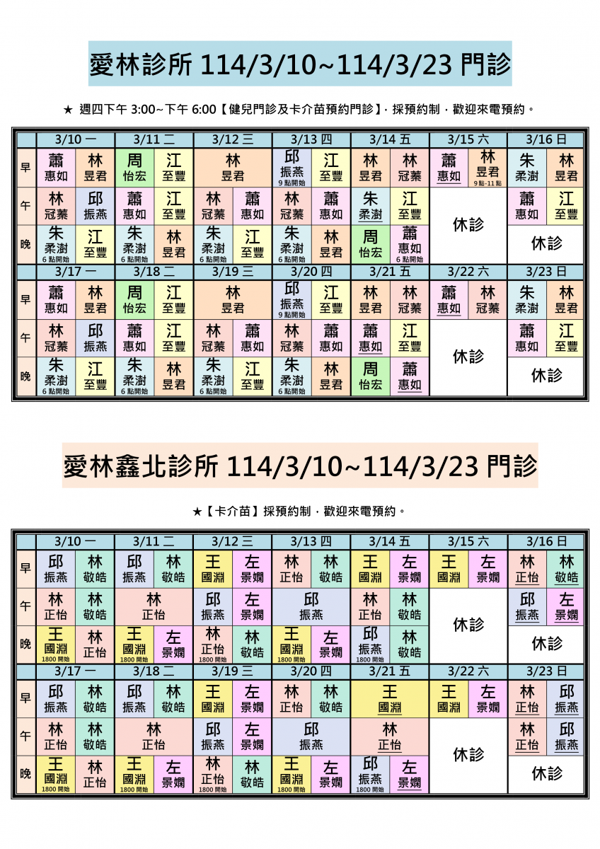 各位親愛的朋友您好:114/3/10-114/3/23兩院區醫師門診公告。