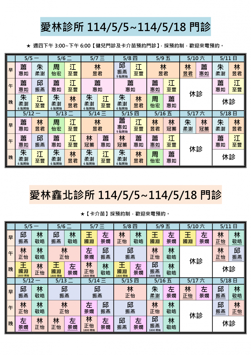 各位親愛的朋友您好:114/5/5-114/5/18兩院區醫師門診公告。