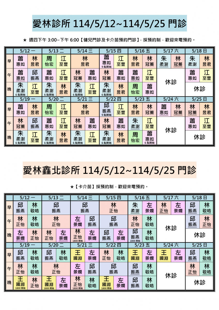 各位親愛的朋友您好:114/5/12-114/5/25兩院區醫師門診公告。